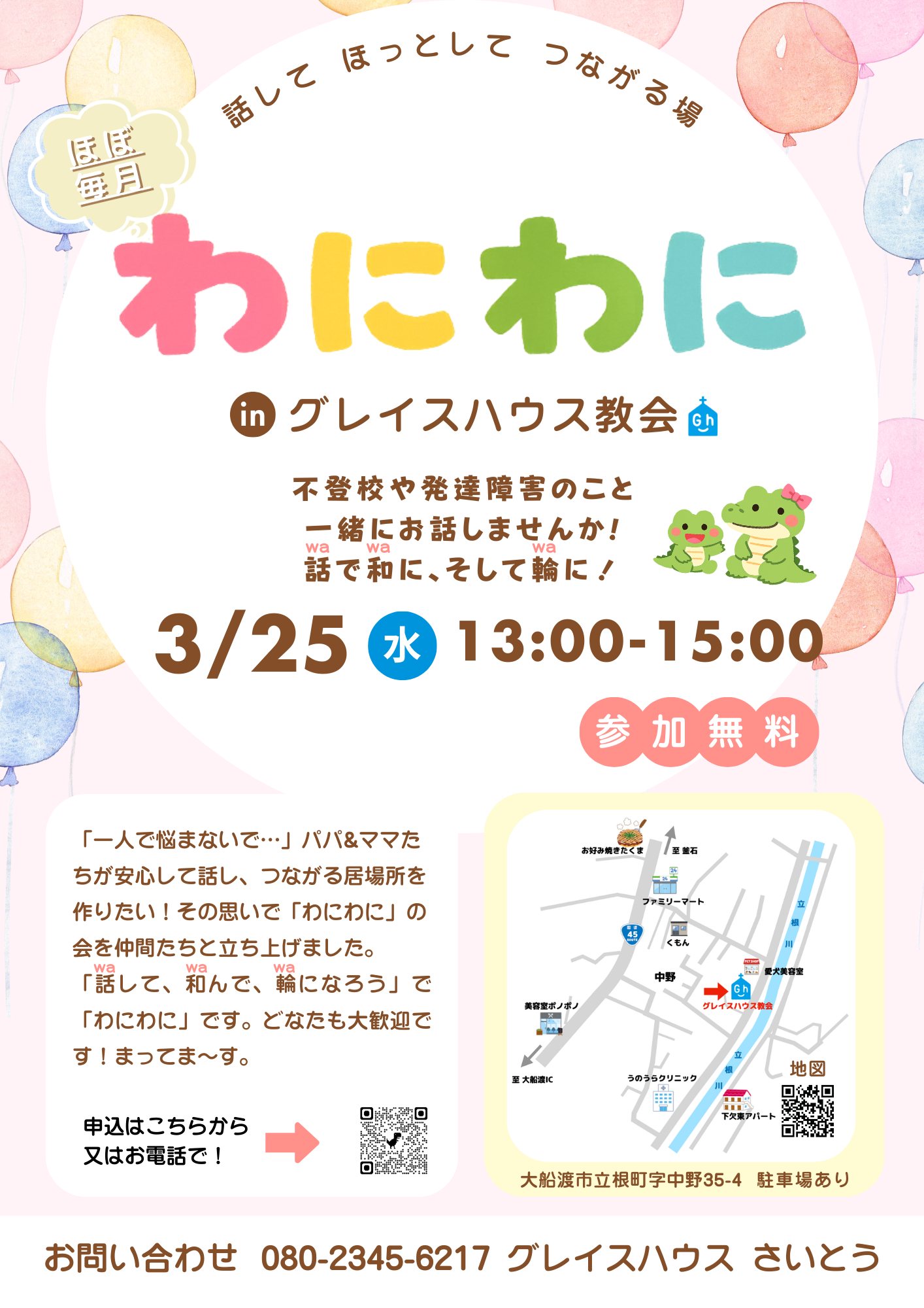 不登校、発達障害のお子さんをおもちの親御さんの話す場所、和む場所、仲間の輪(わにわにの由来)を作る場所をつくりたい…その思いで仲間とわにわに会を立ち上げました。特別なことはできませんが、一緒に話して、泣いて、笑ってあゆんで行けたらとおもいます。
